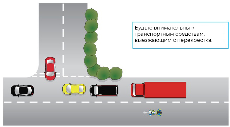 Будьте внимательны к автомобилям, выезжающим с перекрестка.