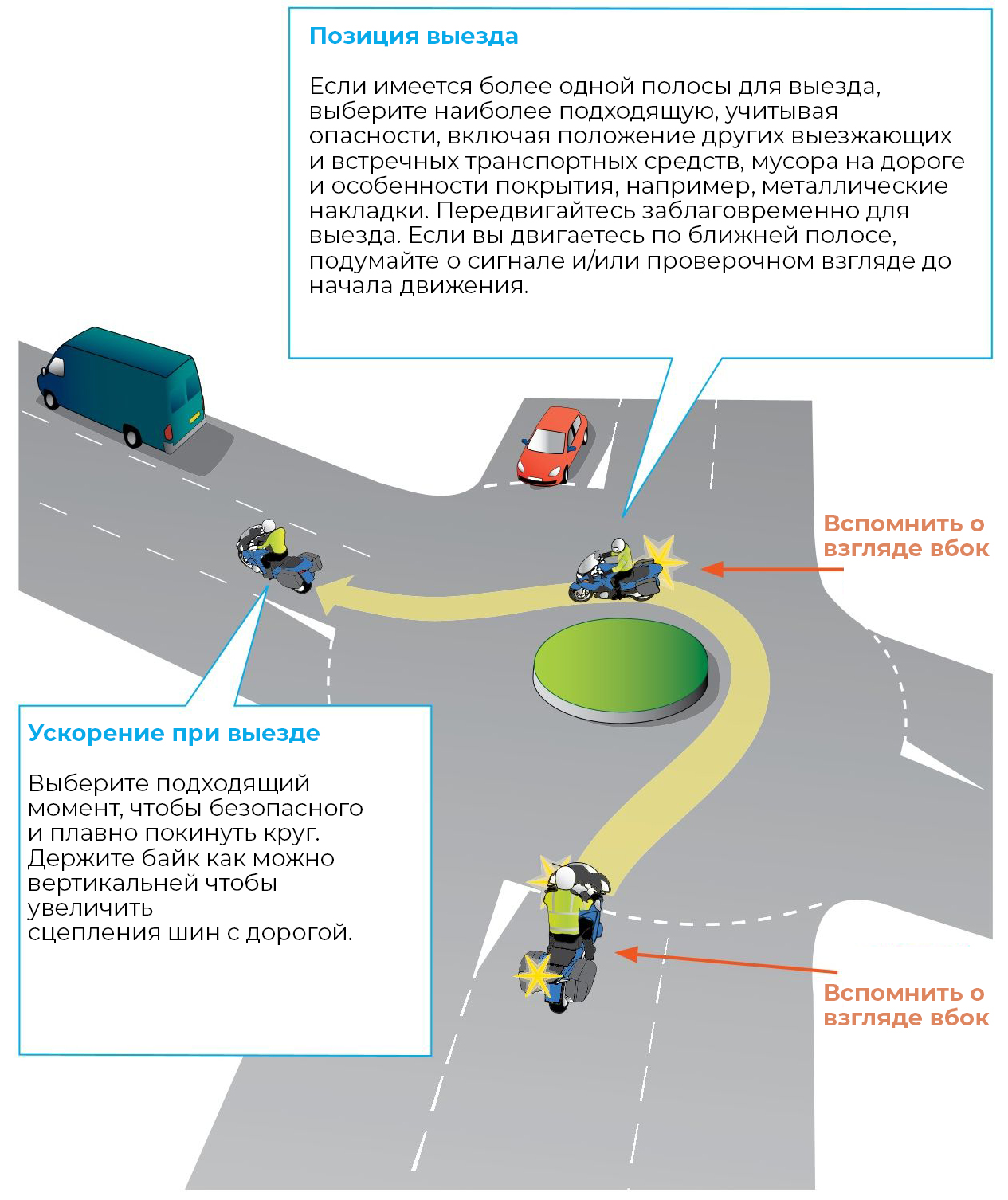 Получите информацию и определите опасность. Сканируйте спереди, сбоку и сзади. Проверьте сзади себя, прежде чем изменить скорость или направление движения. Заранее решите, к какому съезду и по какой полосе приближаться к круговой развязке. Осмотрите дорожное покрытие на наличие всего, что может ухудшить сцепление шин с дорогой: дорожная краска, гладкий битум, масло, бензин или дизельное топливо, пыль или рыхлый гравий. Будьте гибкими: корректируйте свой план езды с учетом новых опасностей.